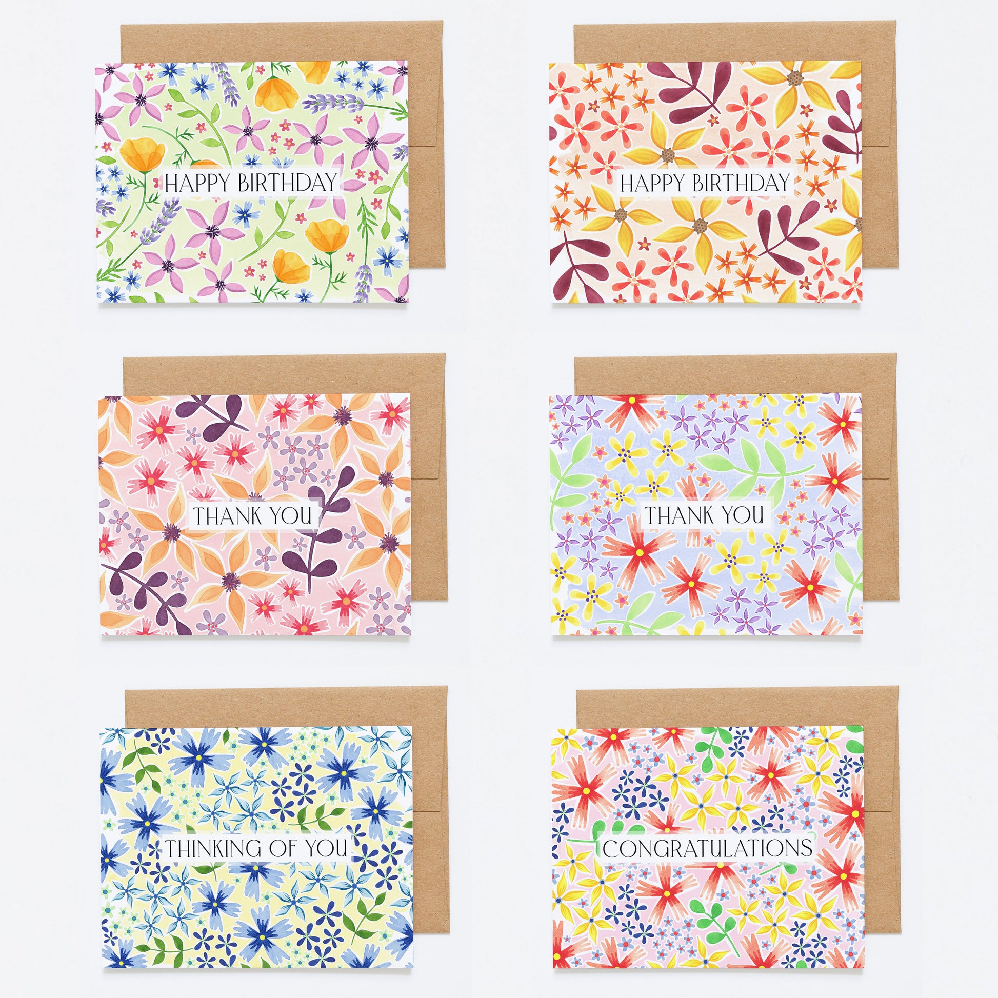 This is a set of 6 assorted occasion cards with 6 brown kraft envelopes included. The set comes in a plastic box.